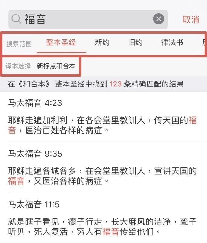在输入框中输入关键词进行搜索。选择“搜索范围”能让搜索结果更为精准。系统默认译本是和合本,若您需要查找其他圣经译本,可点击“新标点和合本”进行切换。