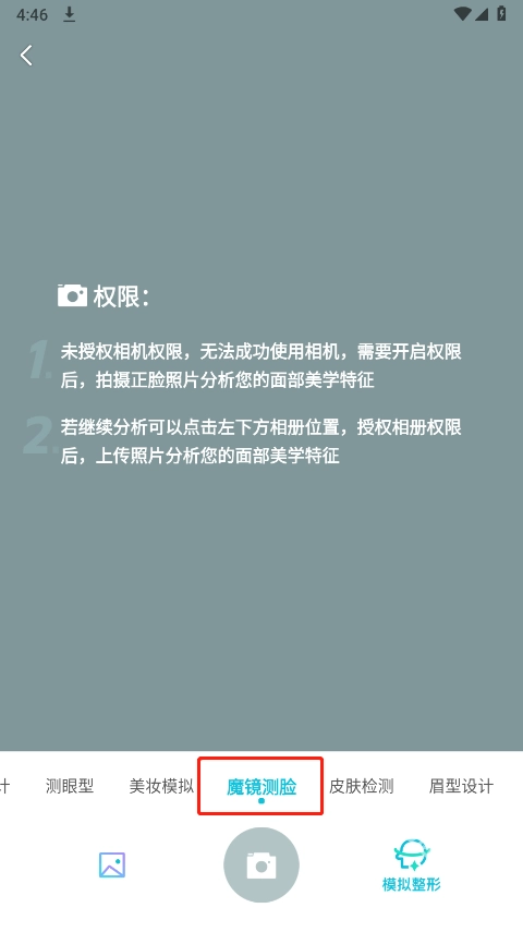 4、打开手机相机权限,选择魔镜测脸即可。