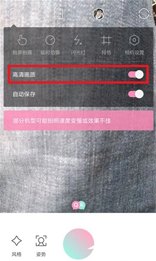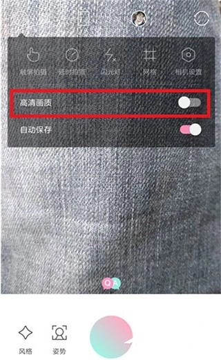 3、点击后顶部会弹出拍照设置界面,找到【高清画质】选项,该选项默认处于关闭状态,点击开启其后方的开关即可。