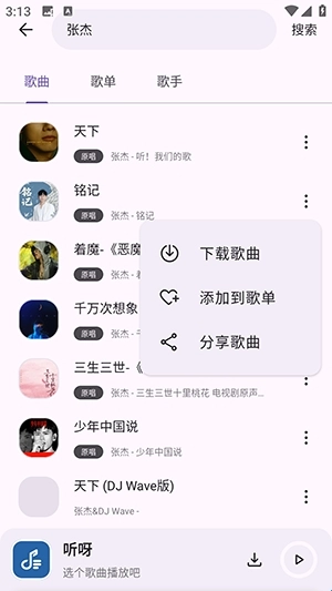 3、找到歌曲右侧的三点图标并点击,在弹出的窗口里选择“歌曲”选项。