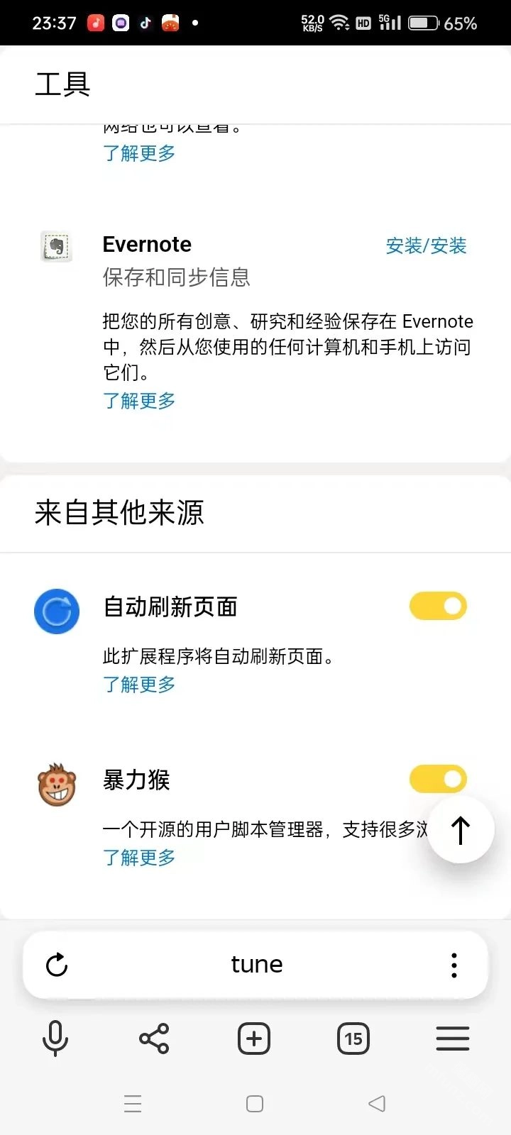 接下来的操作和我们在电脑上的步骤一致,点击添加插件,等待安装完毕。安装完成后,点击网页右下角的菜单,找到扩展选项,就能看到已经安装好的插件了,像自动刷新网站插件和暴力猴插件,都可以正常使用。