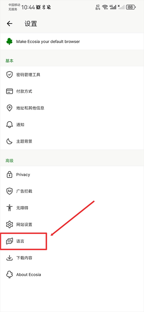 1、在手机上启动Ecosia浏览器,进入该软件的主界面。