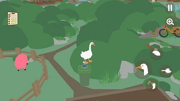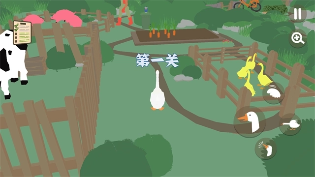 4、右侧按键可操控大鹅完成飞行、叼取物品、扇动翅膀、发出鹅叫等动作,借助这些操作能偷取物品、干扰人类、制造混乱。你需要运用这些技能与人类斗智斗勇,完成各项任务,尽情体验大鹅欢乐捣蛋的日常。