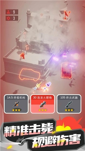 《爆破行动游戏》是一款主打休闲解压的射击类游戏,玩家将化身为雇佣兵,以单兵作战的方式潜入敌方营地制造混乱。在每次执行任务时,你能从品类丰富的武器库中挑选出三把趁手的武器来参与战斗。 游戏里,玩家需要精准消灭敌营内的所有载具和敌人,部分敌人会潜伏在地下,这时你得借助重型武器,凭借无限火力将房屋与地表凿穿,让敌人无处遁形!每次战斗结束后,都能获得三个增益效果,你可以根据自己的作战风格和武器玩法来选择合适的增益,从而让后续的战斗进行得更顺利!