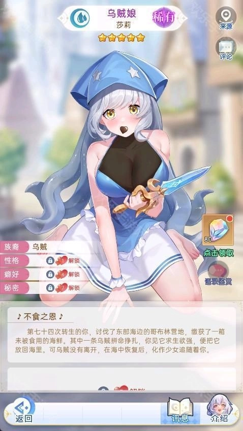 第七十四次转生的你,平定了东部海边的哥布林据点,收获了一箱尚未被享用的海鲜。里面有只乌贼奋力扭动着想要逃脱,你被它强烈的求生本能打动,便将其放回了大海。然而这只乌贼并未就此离去,在海中缓过劲后,竟化作一名少女一路跟随着你。