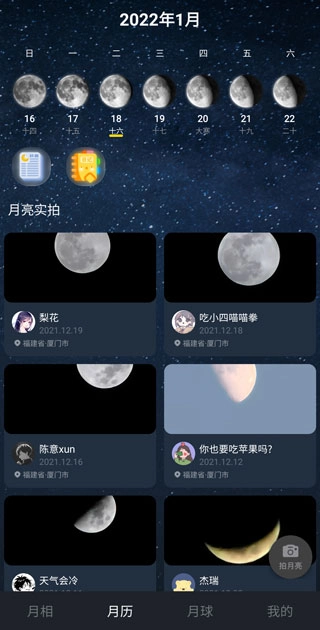 2、月历里会展示出每天用户上传的、在各地拍摄到的月亮形态。