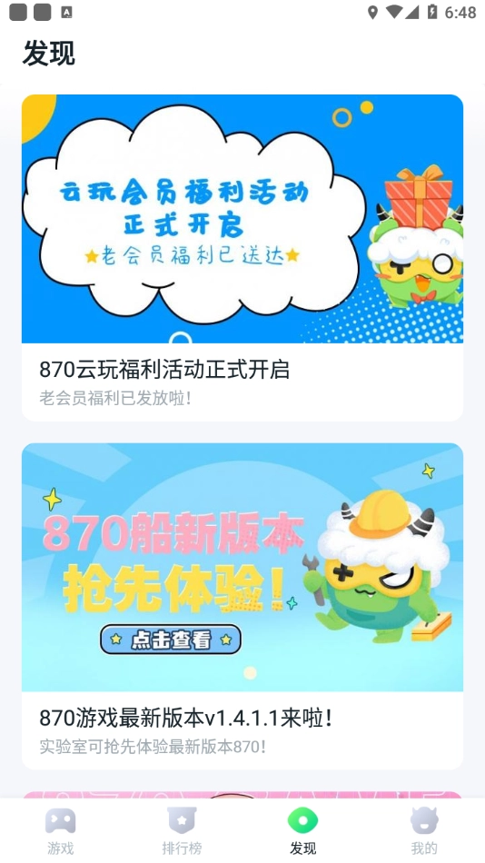 870游戏盒2023是一款可免费提供海量优质游戏资源的软件,它不仅具备丰富的游戏选择与卓越的云游戏技术,还支持用户自由体验各类游戏;平台汇聚了大量热门游戏资源,且带有本地更新功能,每日都会更新新游资源并推荐海量精品游戏,同时为用户提供详尽的攻略与评测内容,感兴趣的话就来安装870游戏盒2023吧!
