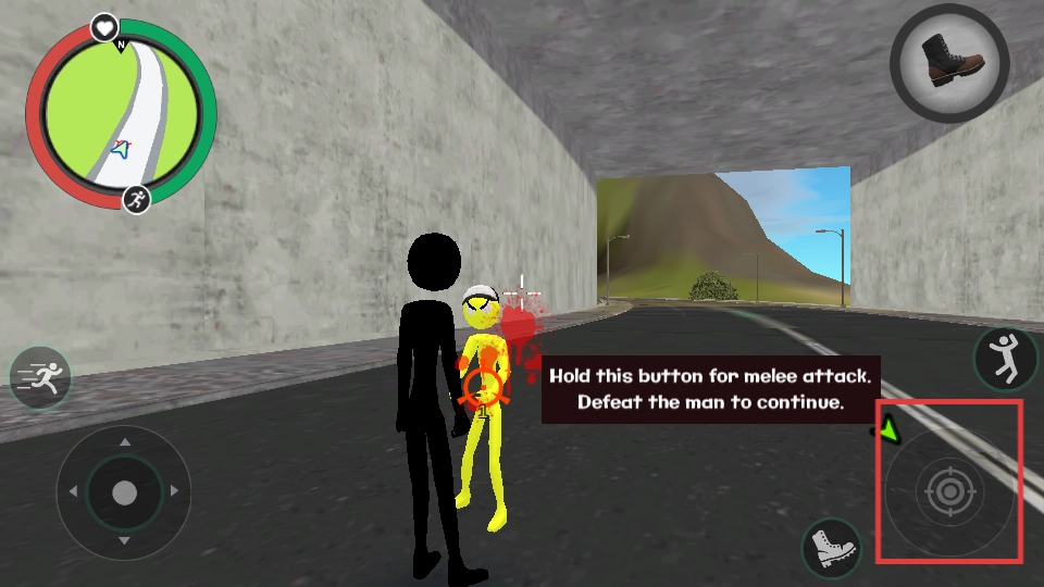 2、长按右侧攻击按钮,对黄色敌人发动近战攻击并击败它。