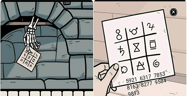 5、来到壁炉那里掀开画框上的白布进入剧情,接着对壁炉使用对讲机收到一张纸条,观察上面的符号,结合收音机的频道数字即可获得四个符号密码。