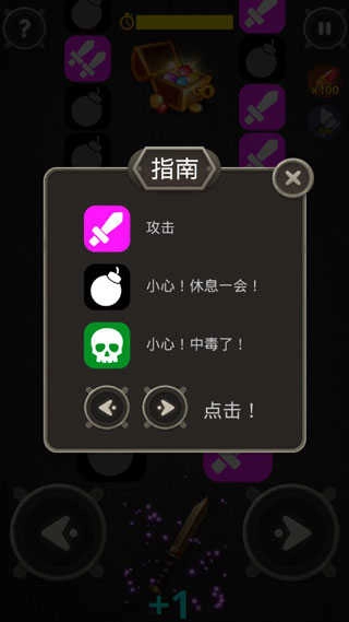 这款游戏的核心操作方式是点击,和常见的下落式音舞游戏玩法相近。游玩时需要点击画面中带有“剑”标识或色彩明亮的图标来累积连击数,不过要注意避开标有“地雷”的图形,一旦误点不仅会中断当前连击,还会扣除游戏剩余时间。