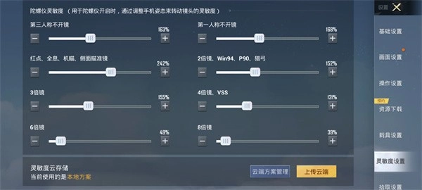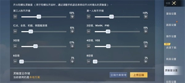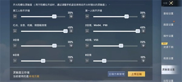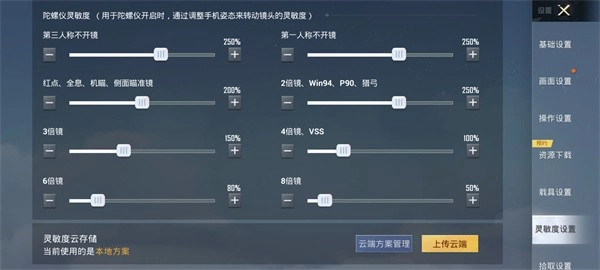 游戏内陀螺仪各场景灵敏度设置如下:第三人称未开启瞄准镜时为250%;第一人称未开启瞄准镜时同样是250%;当使用红点瞄准镜、全息瞄准镜、机械瞄准镜或侧面瞄准镜时,灵敏度调整至200%;搭配2倍瞄准镜、win94、p90或猎弓时,灵敏度设置为250%;3倍瞄准镜对应的灵敏度是150%;4倍瞄准镜和vss的灵敏度为100%;6倍瞄准镜时灵敏度为80%;8倍瞄准镜下则为50%。