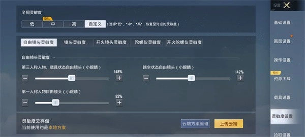 自由镜头灵敏度设置如下:第三人称角色及载具状态下的自由镜头(小眼睛)为148%;跳伞时的自由镜头(小眼睛)为120%;第一人称角色的自由镜头(小眼睛)为83%。