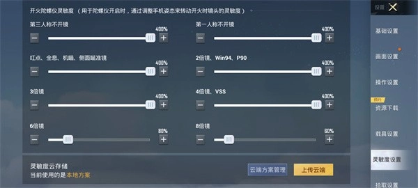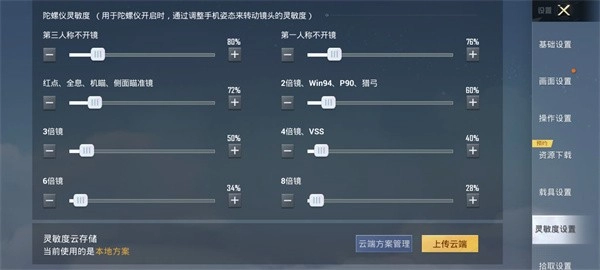 陀螺仪灵敏度:第三人称不开镜:80%;第一人称不开镜:76%;红点、全息、机瞄、侧面瞄准镜:72%;2倍镜、win94、p90、猎弓:60%3倍镜:50%;4倍镜、vss:40%;6倍镜:34%;8倍镜:28%