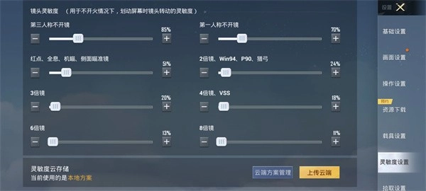第三人称不开镜时为156%;第一人称不开镜时是149%;红点、全息、机瞄以及侧面瞄准镜的灵敏度均为85%;2倍镜、win94和p90对应的灵敏度是119%;3倍镜的灵敏度为127%;4倍镜与vss的灵敏度设置为121%;6倍镜和8倍镜的灵敏度均为5%。