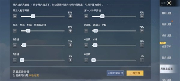 开火镜头灵敏度设置如下:第三人称不开镜时为85%;第一人称不开镜时为70%;红点瞄准镜、全息瞄准镜、机械瞄准镜及侧面瞄准镜均设为52%;2倍镜、win94以及p90对应的灵敏度是24%;3倍镜为25%;4倍镜与vss统一设置成22%;6倍镜和8倍镜则均调整至11%。