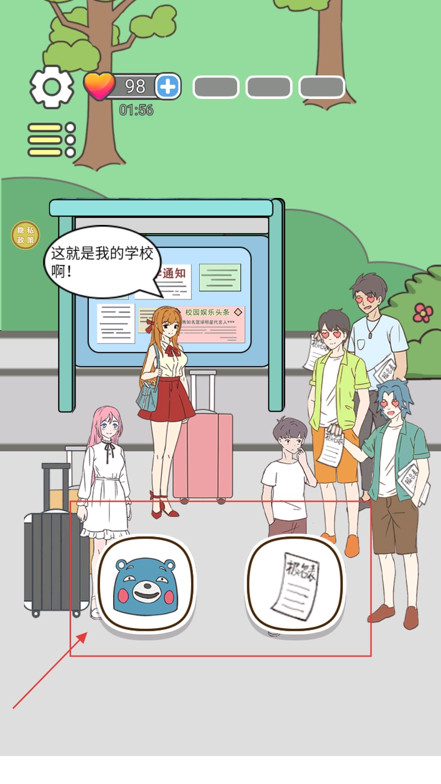 2、在校园场景,选择下方【蓝色小熊图标】,推进迎新相关互动。