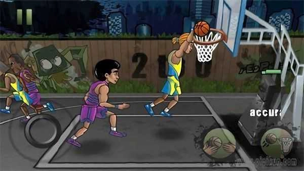 操作起来并不复杂,只需通过手机屏幕两侧的按钮就能完成基础操作:左侧区域的按键负责操控角色的位移,右侧则设有两个功能键,分别对应传球与投篮动作;值得注意的是,传球键在防守场景中还具备抢断对方持球的额外作用。