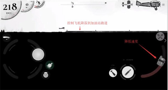 3、期间教程会引导飞机降落加油站,降落前要先降低飞行速度,否则飞机会炸毁,同时也要注意角度,飞机不能过于倾斜,尽量保持与跑道平行。通过油门降低时速后,微调左边的机翼摇杆,选择时机降落到跑道上,飞机会自动加油。