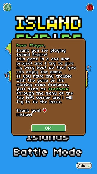 启动《空闲群岛帝国》游戏后,在初始界面点击“OK”按钮,即可确认同意相关条款,顺利进入游戏开始游玩。