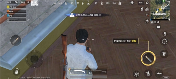 4、右上角是小地图,玩家可以根据地图标识寻找方向,下方倒计时是缩圈倒计时,玩家需要点击地图查看安全区并到达;
