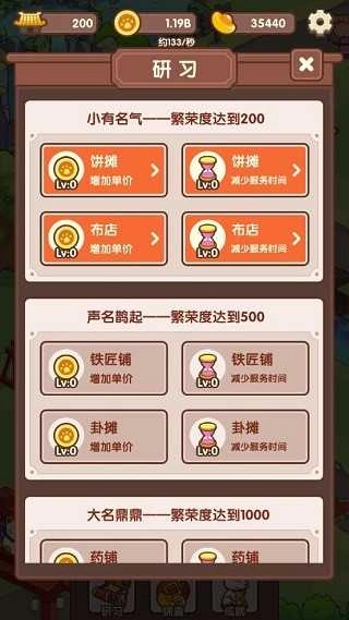 游戏中除了基本的放置模拟经营体验以外,这里还有“研习”、“锦囊”、“成就”等玩法,在研习的功能设置中,您可以就店铺的某一方面进行研究,随着小镇繁荣度的不同,您可以研究的方向也会有所不同,繁荣度的增加是根据玩家开设的店铺数量以及流量有关。