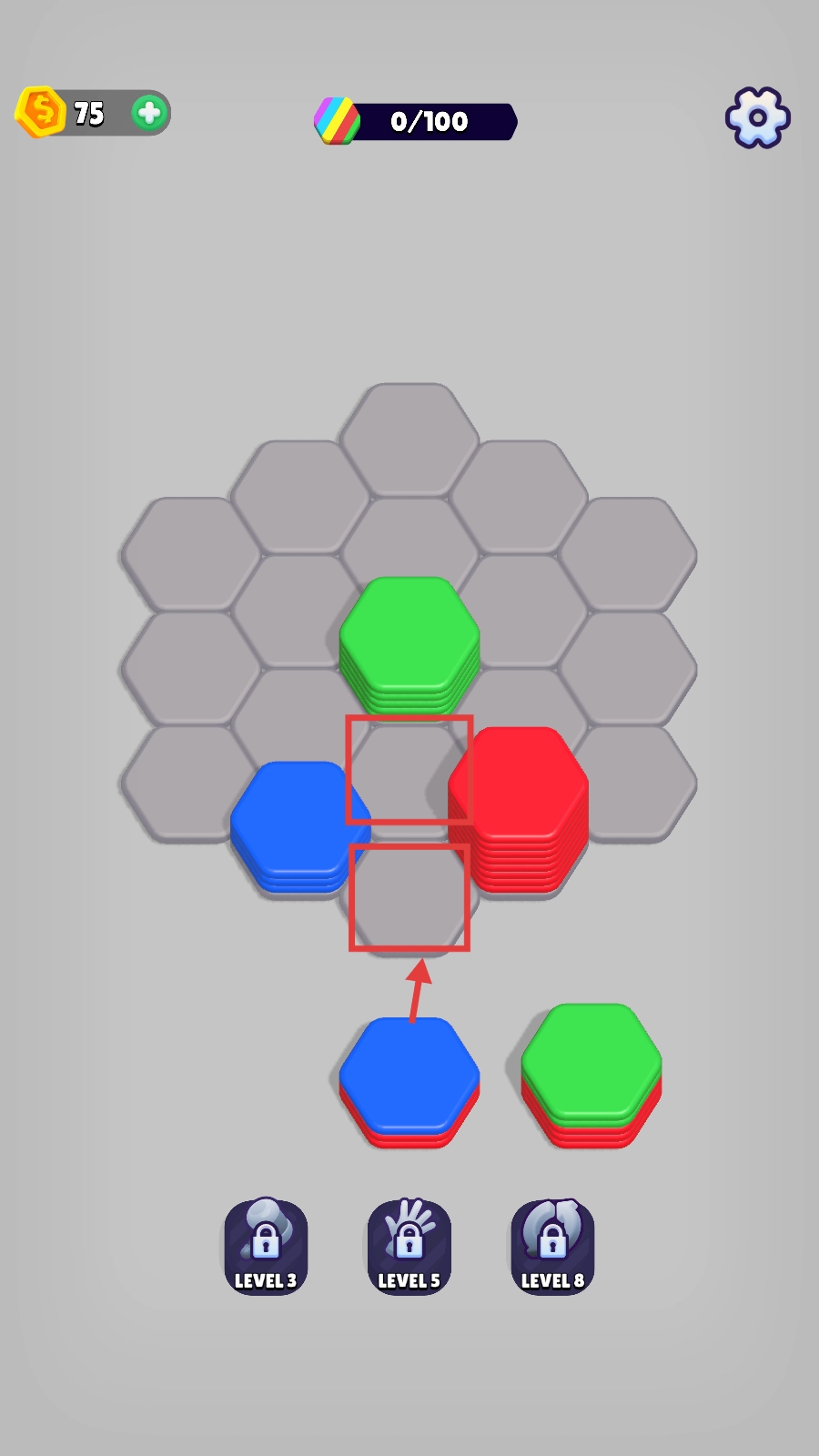 2、接着,我们选择下方的蓝色六边形块,将它放置到上方合适的灰色六边形空位处,让相同颜色的六边形块被附近收集。