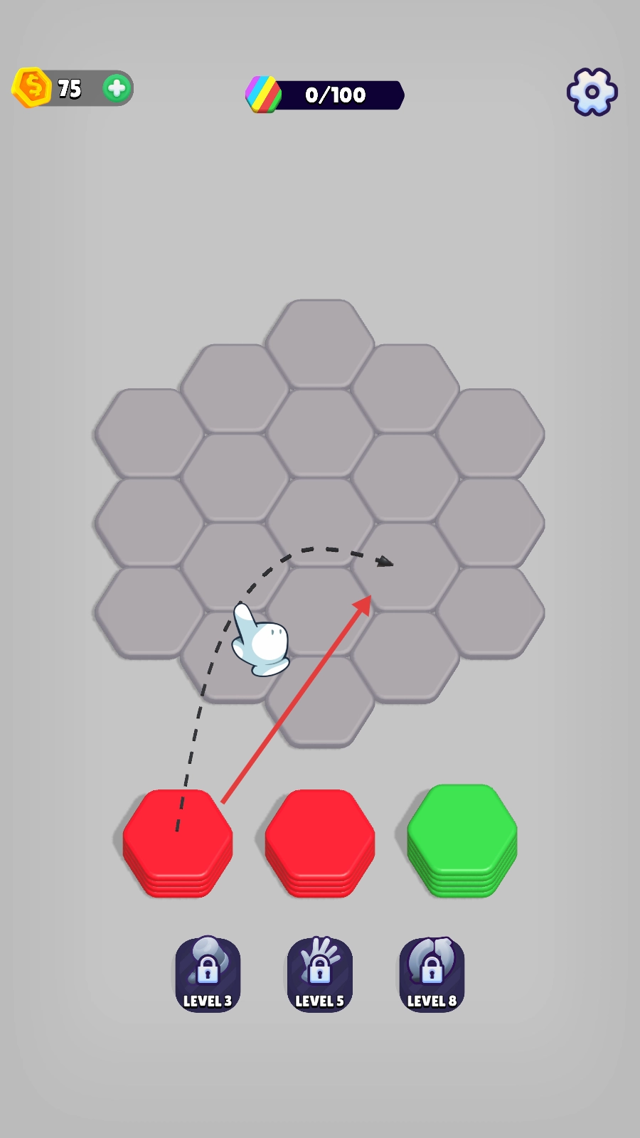 我们需要将下方的红色六边形块,顺着指引的轨迹,拖动至上方灰色的六边形空位中,以此开启拼图的第一步。