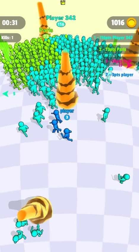 玩家得持续抢夺人群来壮大自己的队伍,队伍人数最多的一方就能赢得最终胜利。2、在游戏里,玩家既要躲避敌人的攻击,还得设法削减敌人的数量,如此才能取得最终胜利。