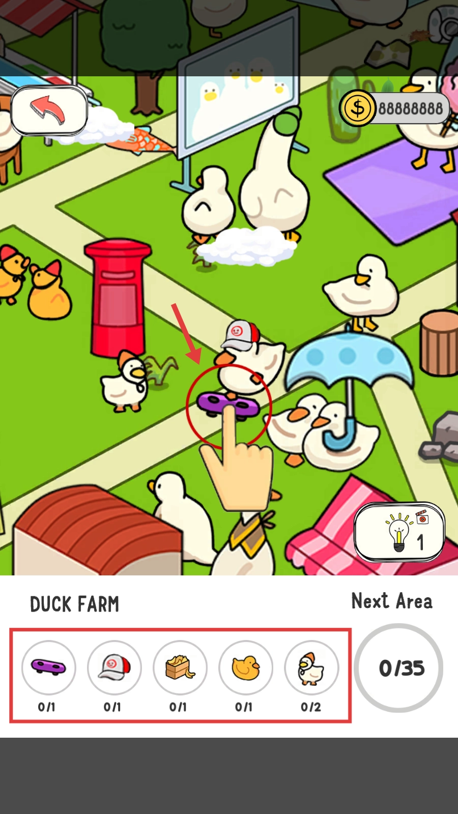 3、进入场景后,我们要根据下方的目标物品提示,在画面里寻找对应的物品,比如找到紫色滑板就点击它。
