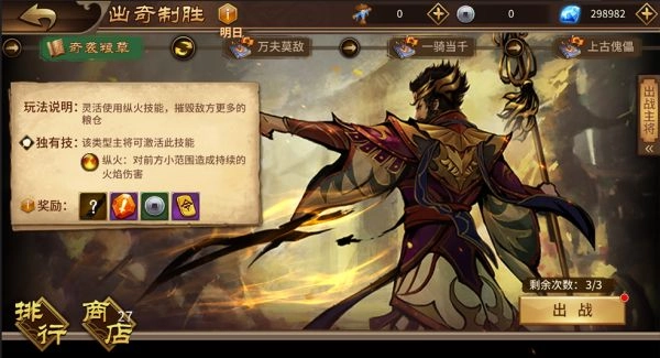 当出战主将在某类特定关卡(例如一骑当千)中取得的最高积分超过500分时,即可在该特定关卡启用扫荡功能。