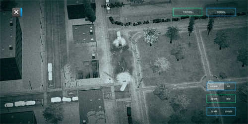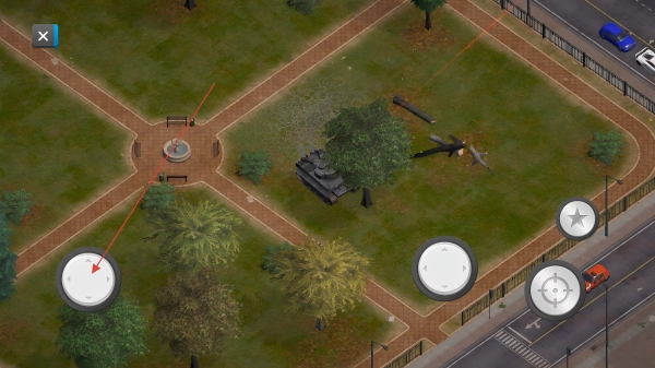 3、坦克在公园区域,滑动屏幕操控左下移动键控制坦克对场景建筑、地形进行摧毁。
