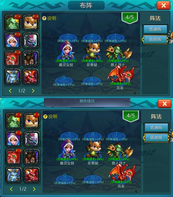【盾地阵】:可使1、3、7、9位置生物受到的伤害减免15%,5号位生物受到的减免25%。