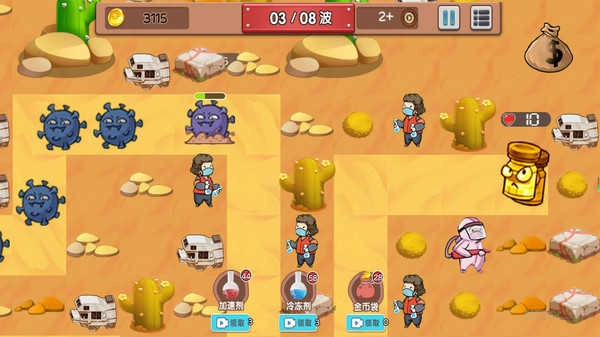 《塔防的策略战争》是一款颇具趣味的策略塔防游戏,它采用简洁的2D卡通风格画面打造。在游戏里,玩家能够从拥有各异能力的医护人员中自主挑选角色,将其放置在地图上后,这些医护人员便会自动对来袭的病毒展开攻击。只要成功保卫家园免受病毒入侵,玩家就能顺利完成关卡挑战。