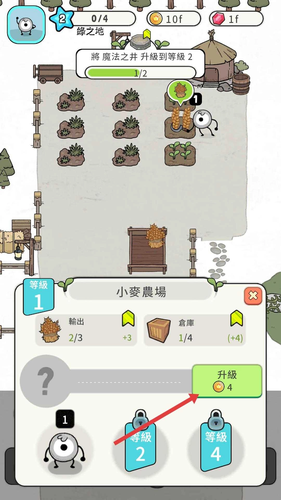 2、在农场界面,若要升级农场,点击绿色升級按钮,消耗4枚金币,就能提升农场等级,增加小麦输出与仓库容量。