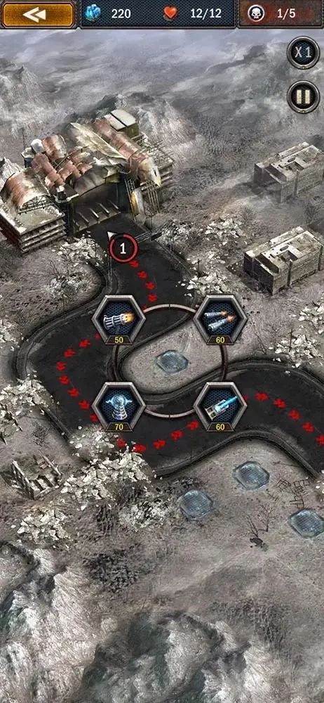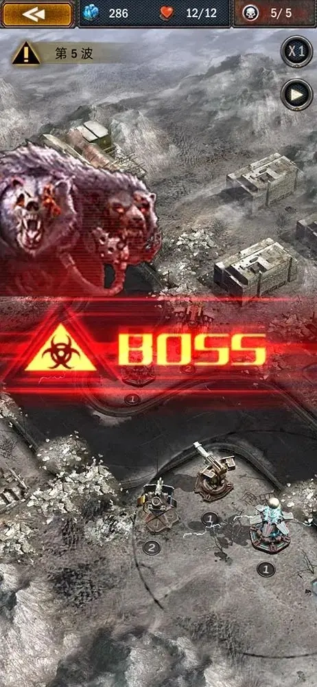 点击带有半透明蓝色效果的区域,可在此处搭建具有攻击能力的设施,这类设施能对敌方目标发起攻击并造成伤害。右上角显示的数值表示当前正处于第几波攻势,以及本关卡总共会出现多少波敌人。当最后一波敌人发起进攻时,会有实力强劲的首领级敌人登场。