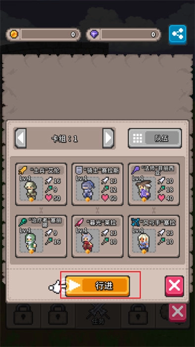 3、选定之后,玩家将需要带着自己的队伍来进行战斗,点击下方的黄色【行进】按钮即可;