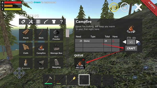 4、右侧显示出搭建Campfire需要24块石头。