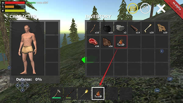 6、搭建完成后,可以在INVENTORY中看到一个营火图标,拖动这个图标到石斧等一行的那6个小框框中。