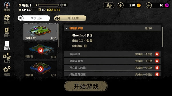 任务:除了必须完成的地图任务外,还有每日任务。每个角色拥有3个独立的每日任务,玩家可以切换角色来继续完成每日任务。任务奖励宝箱分为3个档次,前两个档次的奖励基本可以忽略不计,建议直接跳过;最后一个档次的宝箱开出紫装的概率为20%(等级不满50级时概率会更低)。玩家可以通过观看广告来额外领取一个宝箱,也可以利用广告缩短任务间隔时间。