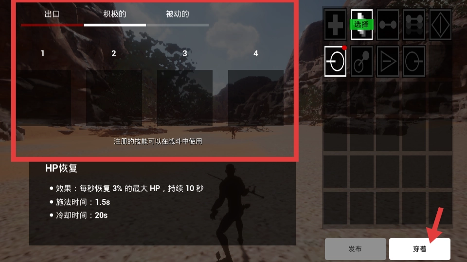 2、在技能界面可选择积极或被动技能,注册后能在战斗中使用,比如选择HP恢复技能,了解其效果、施法时间和冷却时间,然后点击穿着装备技能。