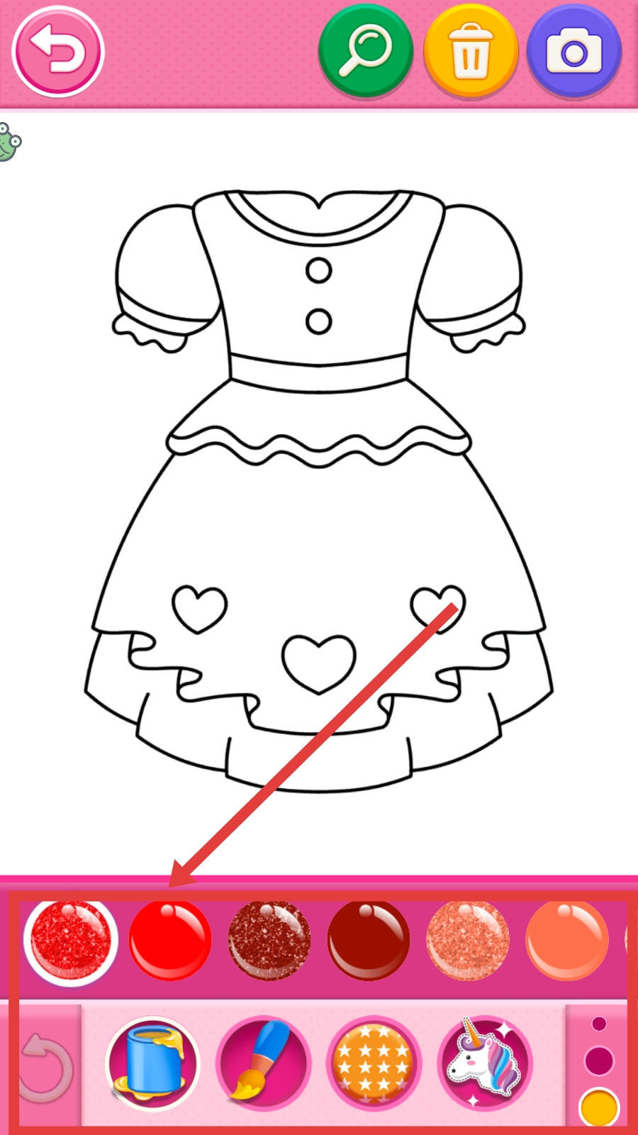 3、从下方颜料选色,点击服装区域,进行涂色操作。