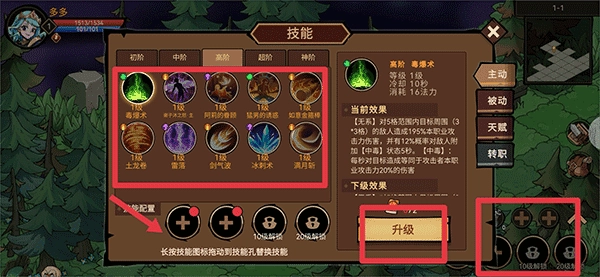 5、屏幕右下角支持配置多个技能,解锁后将其拖入技能栏即可使用,还能通过技能升级进一步强化角色属性。