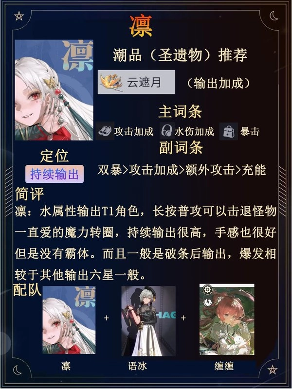 【凛】是一位水属性的输出型角色,她的长按普攻具备击退敌人的效果,持续输出的表现十分出色,操作起来手感也很流畅。不过,她没有霸体机制,在破条之后的爆发输出能力相对来说比较一般。