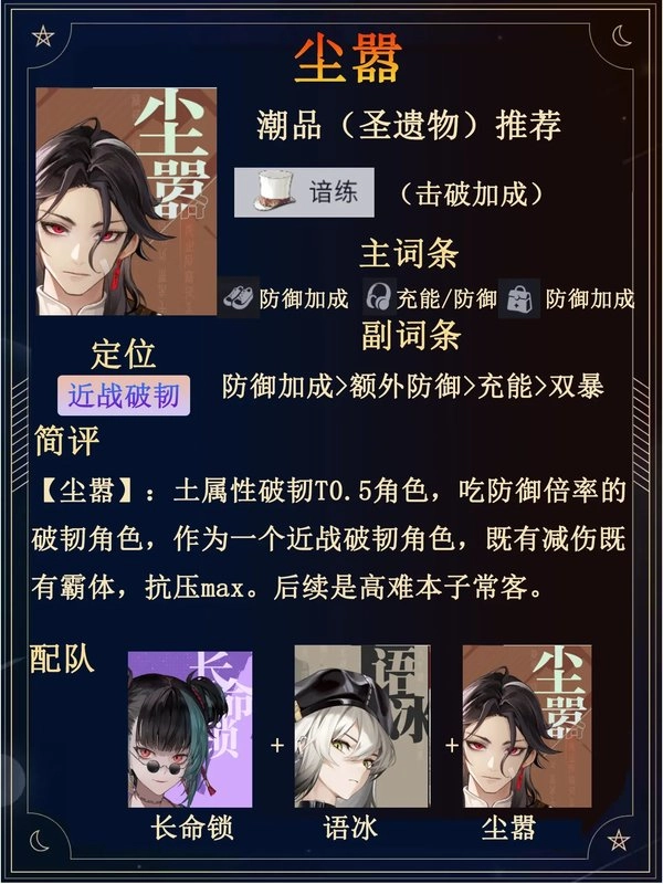 【尘嚣】是一位土属性的破韧角色,其破韧机制依托防御倍率展开,此外还拥有减伤与霸体的特性,这使得他的抗压能力极为出色,在高难度副本里有着亮眼的表现。