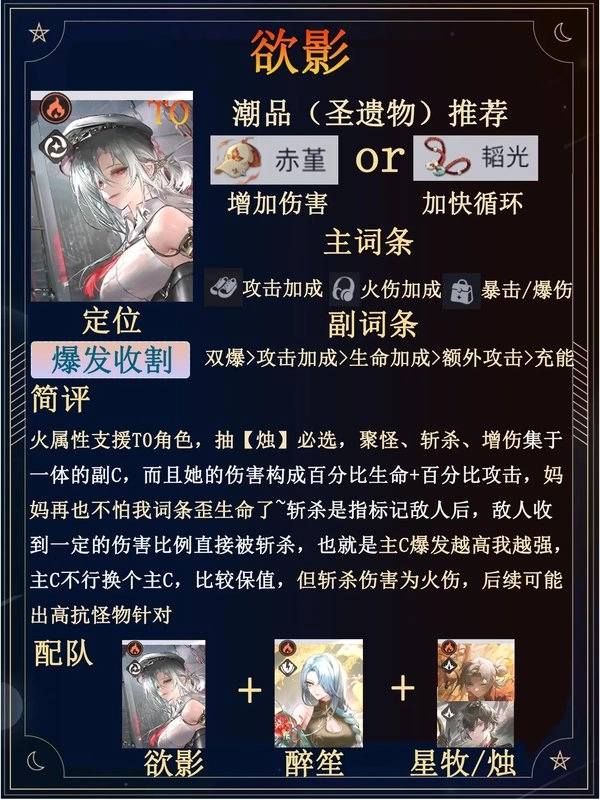 【欲影】是火属性辅助里的顶尖角色,集聚怪、增伤与斩杀能力于一身,在队伍中是不可或缺的副C。她的伤害基于百分比生命值和攻击构成,这让词条分配更为灵活。她的斩杀机制需要先标记敌人,之后依据敌方承受的伤害比例直接完成击杀,特别适配主C爆发高的阵容。但要留意的是,后续或许会出现对火属性拥有高抗性的怪物。