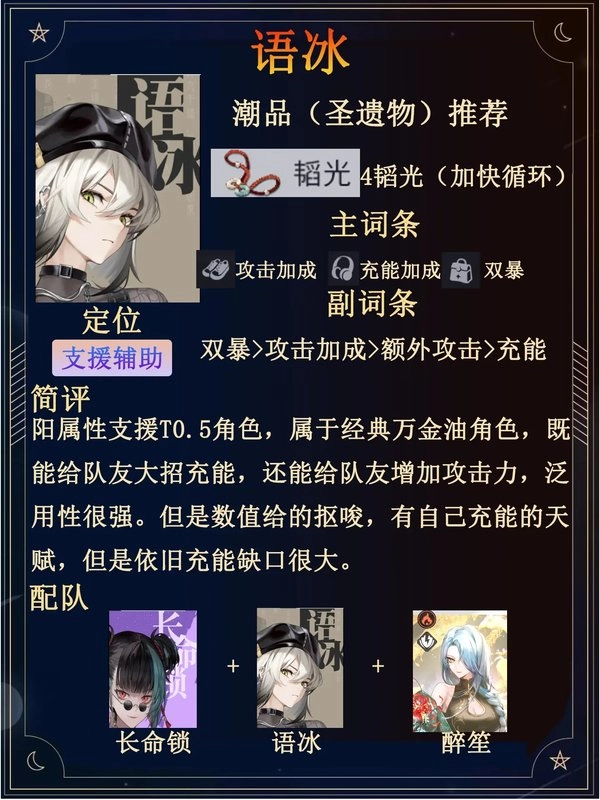 【语冰】是一名阳属性的辅助角色,堪称辅助里的“万金油”——既能帮队友快速充能放大招,又能为队伍提升攻击力。虽然她的基础数值设定得比较保守,但靠着独特的天赋机制,依然能在各式各样的阵容搭配里找到自己的位置,发挥不小的作用。