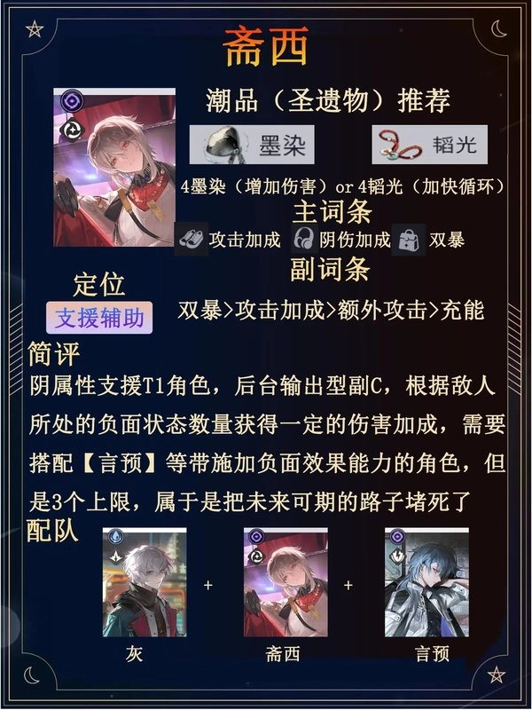 【斋西】定位为阴属性辅助型角色,核心优势在于后台输出能力,其伤害加成机制与敌人身上的负面状态数量挂钩,该加成最多可叠加至三层。因此,她需要和能够施加负面效果的角色搭配组队,例如言预这类角色。尽管她的伤害上限存在一定限制,但在适配的特定阵容体系里,依然能发挥出亮眼的表现。