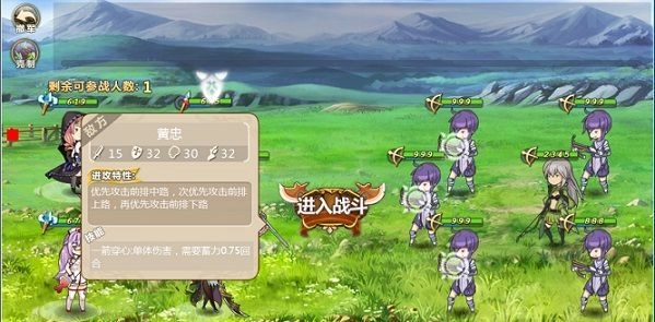 3、黄忠的蓄力攻击威力十分惊人,在战斗初期需要借助于吉和华佗的技能来尽快削减他的生命值,以此减轻后续所面临的伤害压力。