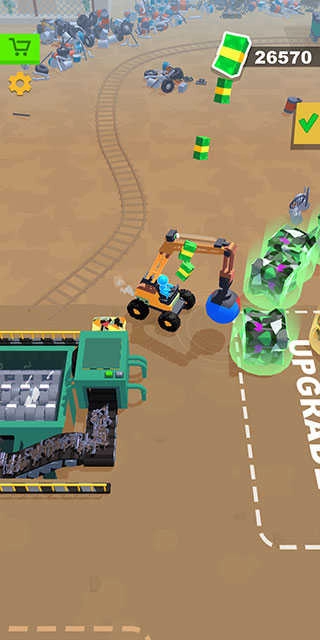 1、利用垃圾处理工具来达成任务,通过磁铁和垃圾清运车对后方的垃圾进行清理,以此获得收入。