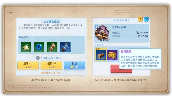 英灵升级的好处多多,既能提升自身战斗力,又能让可率领的士兵数量增加。在战斗过程中,英灵的生命条会清晰地显示出带兵量的变动情况。要是击败了地图上的普通矮人军团,就能直接得到经验;而挑战时光之井里的星级关卡,能获取经验卷轴,不过这个卷轴得手动在升级面板进行使用。